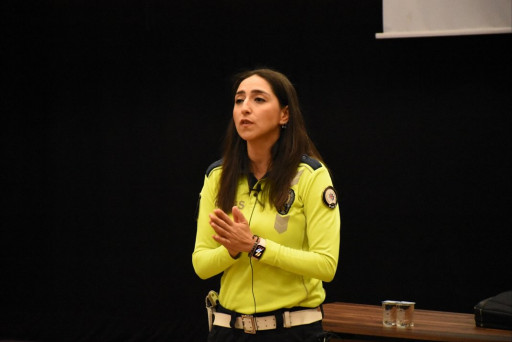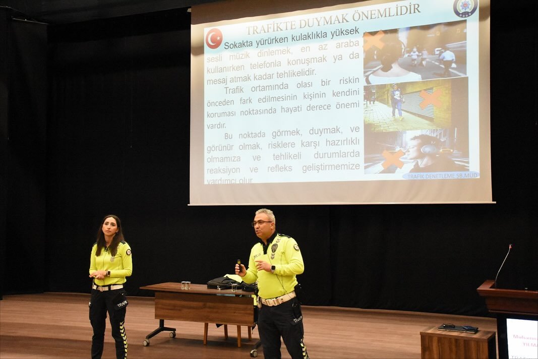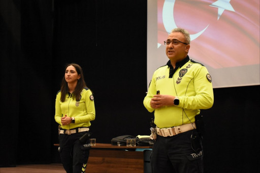 Trafik sorunu artık toplumsal bir konu, ülke olarak trafik kazalarında hala çok kayıp veriyoruz. Trafikte kurallara uymadığımızda kazaya ya da karmaşaya neden oluruz bu yüzden felsefemiz “Lütfen Trafikte Soruna Değil Çözüme Ortak Olunuz.” olmalıdır diyerek trafik kurallarına uyulmadığında yaşananları çarpıcı örneklerle gösterdiler ve trafik kuralları hakkında uyarıcı ve bilinçlendirici bir eğitim gerçekleştirdiler. Programın kapanışında teşekkür konuşmalarını yapan Okul Teknik Müdür Yardımcımız Mehmet Burhan AYTAÇ ve Okul Müdür Yardımcımız Sayın Gönül TÜRÜT KESİM hayatın içinden olan bu konuyu bu kadar etkileyici bir sunumla anlattıkları için teşekkür ettiler.